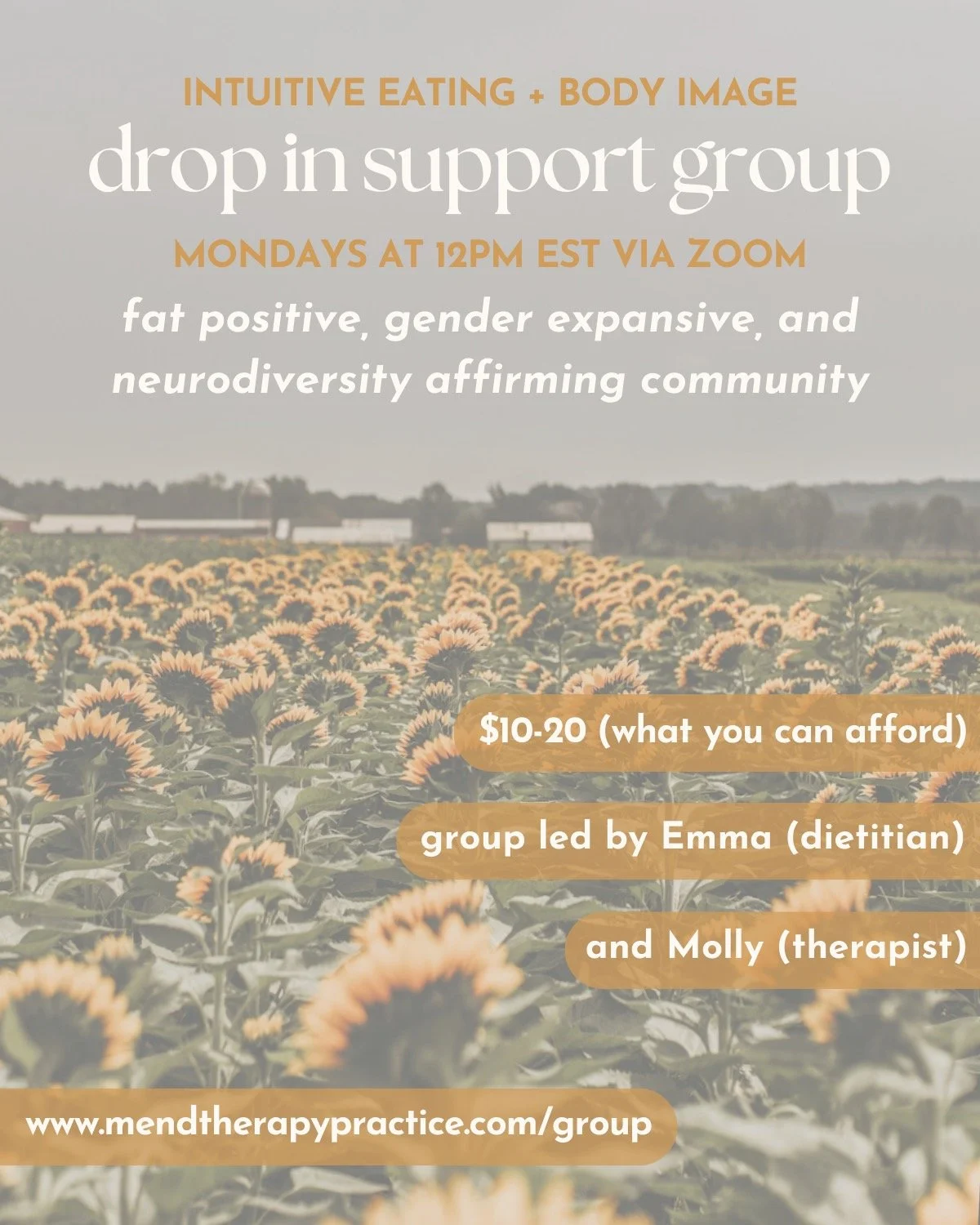 This group is led by two licensed professionals, Emma D'Arpino RD LDN (a registered dietitian) and Molly Robson LICSW (a therapist) and comes together weekly on Mondays at 12pm EST via Zoom.